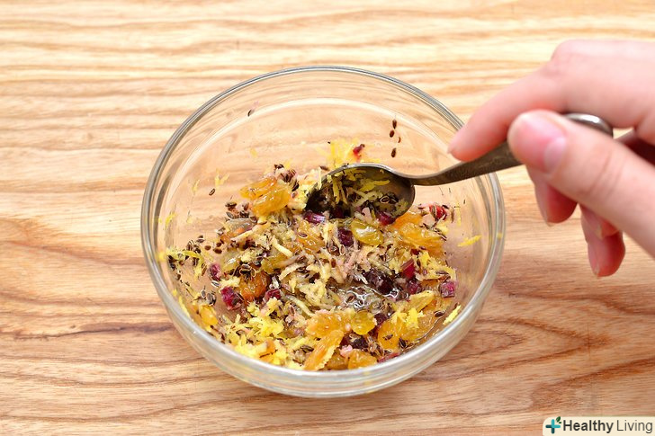 Змішайте кріп, оцет, цибулю-шалот, імбир, цедру лимона і сіль разом в невеликій мисці.збийте з оливковою олією, а потім додайте родзинки.