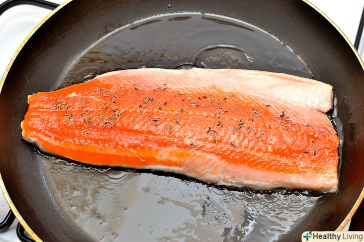 Змастіть оливковою олією сковороду і нагрійте на середньому вогні.покладіть філе на сковороду шкірою вниз, нехай готується близько 5 хвилин, перевернувши рибу один раз лопаткою. Поверхня риби повинна бути злегка підрум'яненою, і вона повинна бути приготовленої всередині.