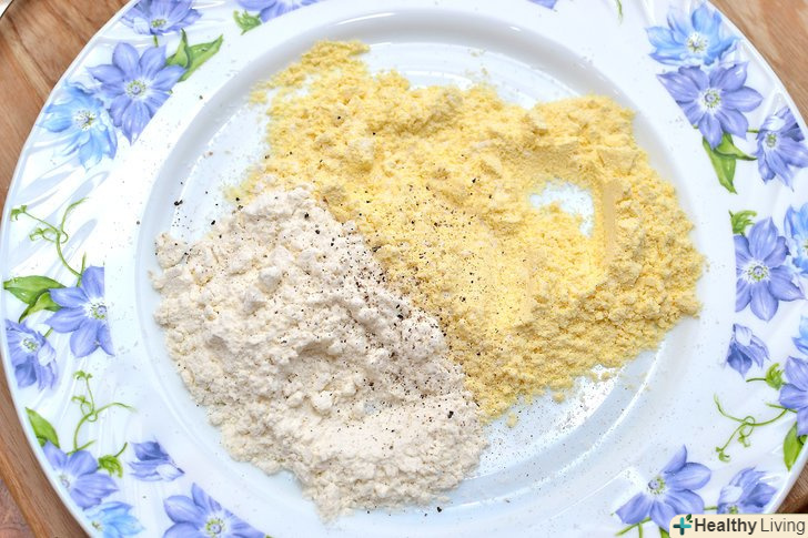 Змішайте борошно, кукурудзяну муку, сіль і перець разом в невеликій мисці.розподіліть суміш рівномірно на тарілці.