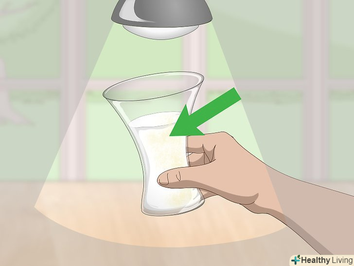 Перевірте, чи не змінило молоко колір.налийте молоко в прозорий стакан і піднесіть до світла. Якщо молоко все ще хороше, воно буде натурального, чистого, білого кольору. А ось скисле, як правило, тьмяне або має жовтий відтінок.[4]- Якщо вам важко визначити колір молока, помістіть білий аркуш паперу позаду склянки або поруч з ним і порівняйте. Якщо у молока є жовтуватий відтінок, швидше за все, воно зіпсувалося.