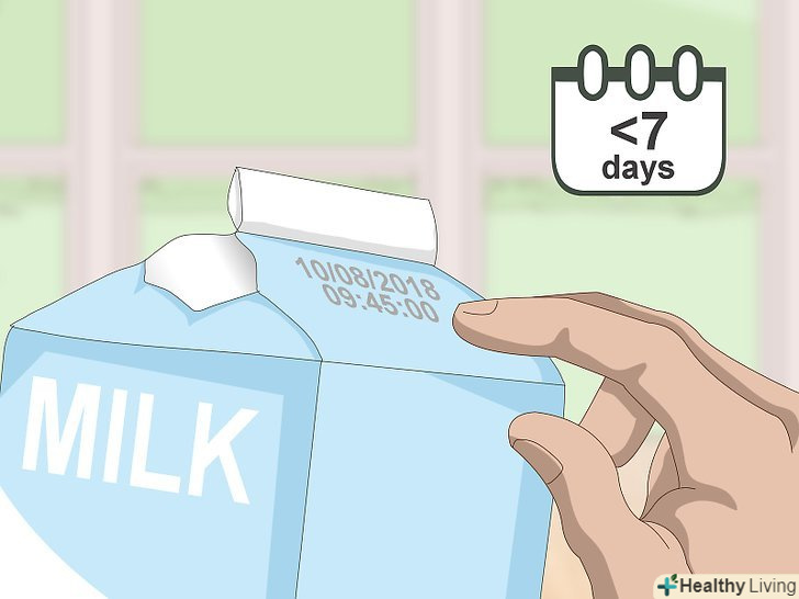 Переконайтеся, що з моменту закінчення терміну придатності пройшло не більше 7 днів.при належному зберіганні молоко буде придатним протягом 7 днів після закінчення терміну придатності, зазначеного на упаковці. Однак, якщо термін придатності вийшов, а про молоко зовсім забули, висока ймовірність, що воно зіпсувалося.[6]- Період придатності молока залежить від кількості жиру і лактози в ньому. Незбиране молоко може зберігатися тільки 5 днів після закінчення терміну придатності. А ось безлактозное або знежирене молоко може залишатися свіжим ще аж до 10 днів.
