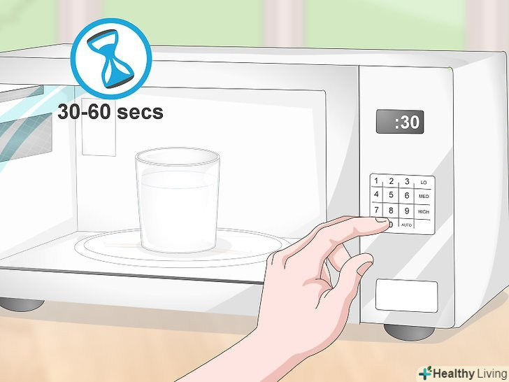 Нагрівайте молоко в мікрохвильовій печі протягом 30-60 секунд.помістіть склянку молока в мікрохвильову піч і нагрівайте від 30 секунд до однієї хвилини. Якщо у вас велика мікрохвильова піч високої потужності, використовуйте менший період часу.[8]- Якщо ви не знаєте, як довго нагрівати молоко, почніть з 30 секунд. Якщо воно не нагрілося за 30 секунд, залиште ще на півхвилини.