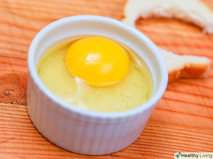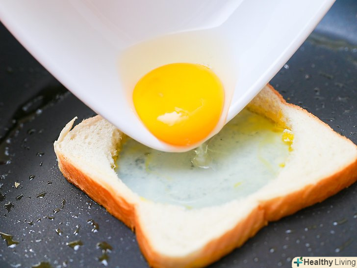 Додайте яйце. перш ніж покласти яйце в отвір в хлібі, додайте ще трохи масла в цю дірку. Розбийте яйце і перелийте його в отвір.- Якщо ви хочете, щоб в страві виявилося менше білка, відокремте білок від жовтка. Покладіть жовток в отвір і додайте зовсім небагато білка. Завдяки цьому яйце засмажиться швидше. [3]