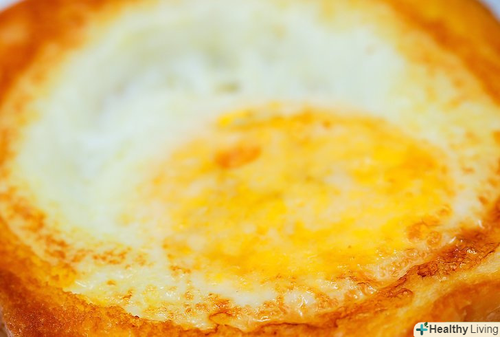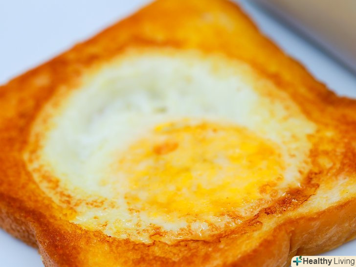 Підсмажте хліб. покладіть на сковороду масло. Поки воно буде танути, намажте масло на обидві сторони хліба. Покладіть хліб на сковороду. Підсмажте хліб на середньому вогні, поки він не почне підрум'янюватися. [2] переверніть хліб на іншу сторону. Засмажте до золотистої скоринки.- Можна намазати маслом серцевину і підсмажити її разом з яйцем. Багато вмочують залишилася серединку в жовток.