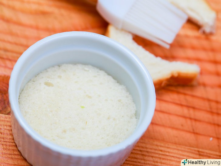 Покладіть хліб у форму. намажте хліб маслом з обох сторін і перекладіть у форму. Якщо форма маленька, акуратно підігніть краю.- Оскільки в цьому рецепті страва не смажиться, а запікається, їжа буде більш корисною і не дуже калорійною. Щоб скоротити кількість калорій і отримати корисне блюдо, вибирайте низькокалорійний і низьковуглеводний хліб.