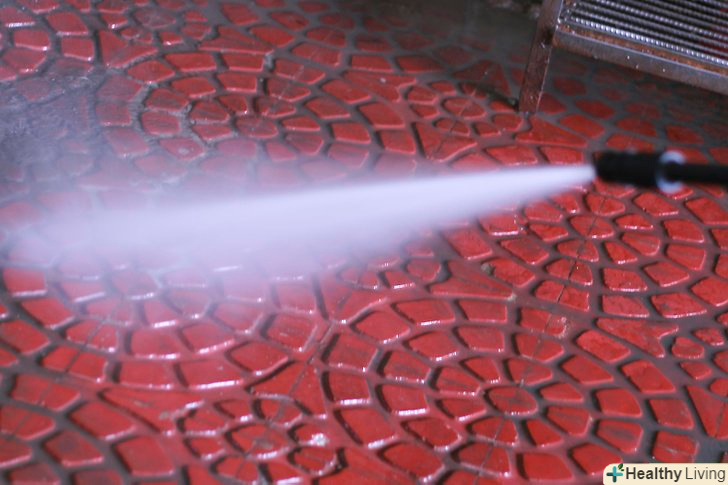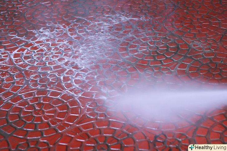 Нанесіть миючий засіб, почавши знизу і поступово рухаючись вгору. Перед тим як змиєте засіб, дайте йому просочити поверхню об'єкта протягом трьох хвилин. Не чекайте занадто довго, інакше миючий засіб може засохнути. Змийте об'єкт мийкою, почавши зверху і поступово спускаючись вниз.
