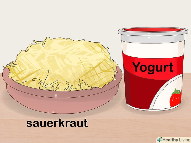 Додайте пробіотики.пробіотики-це корисні бактерії, які допомагають перетравлювати їжу і захищають людину від хвороб. Ці бактерії допомагають кишечнику більш ефективно перетравлювати і виводити аміак. До продуктів, що містять пробіотики, відносяться кисломолочні продукти, на зразок кефіру, і ферментовані харчові продукти, на зразок квашеної капусти.[12]- Наприклад, намагайтеся щодня їсти порцію йогурту. У йогурті міститься багато пробіотиків і він корисний не тільки для травлення, але і для всього організму.[13]