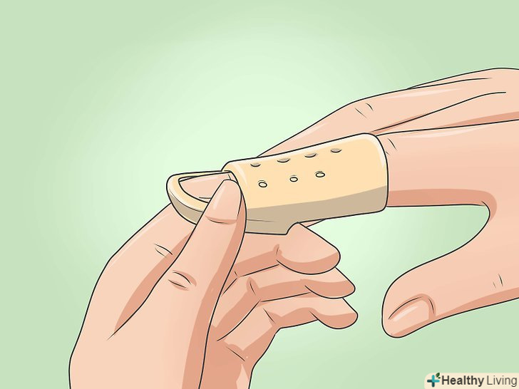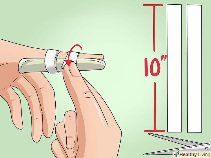 При необхідності використовуйте пластир.відріжте ножицями смужку довжиною 25 сантиметрів і щільно оберніть шину і травмований палець між першим і другим суглобами.[20]- Деякі трубчасті шини вже мають регульований ремінець, і в такому випадку можна обійтися без пластиру.
