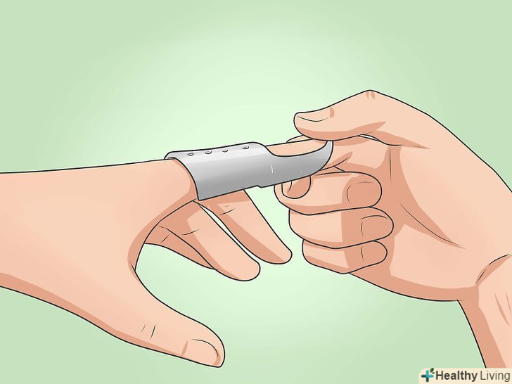 Накладіть шину на клацаючий палець.випряміть його, підтримуючи іншою рукою. Обережно одягніть нерухому шину на травмований палець, щоб вона повністю сіла.[15]- Переконайтеся, що нерухома шина щільно прилягає і палець дійсно випрямлений. Якщо палець злегка зігнутий вперед або назад, це може привести до появи нариву на суглобі.