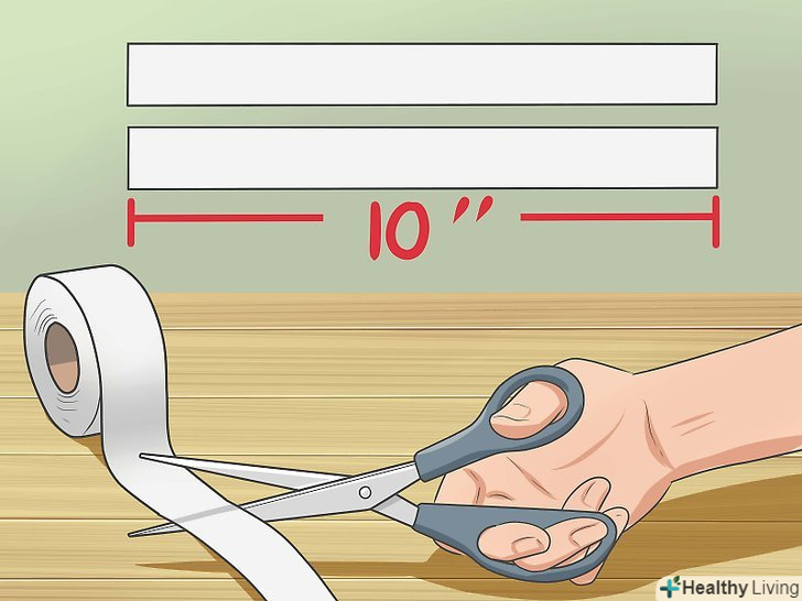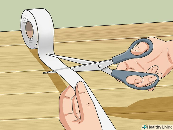 - Якщо у вас немає під рукою пластиру, можна закріпити шину вузькими стрічками тканини довжиною 10-13 сантиметрів, проте врахуйте, що краще використовувати аптечний пластир. Вам знадобиться 1,5-сантиметрова тканинна стрічка, яку можна купити в найближчій аптеці.