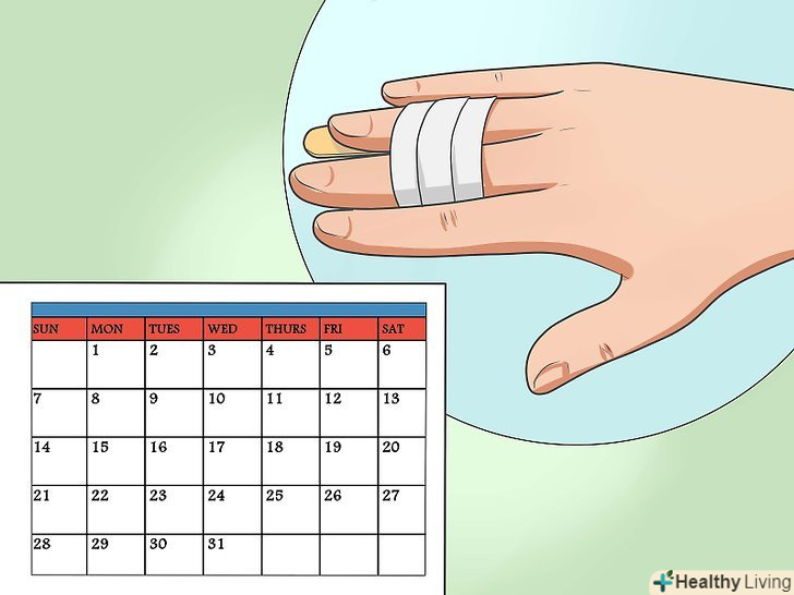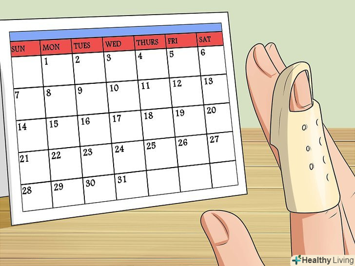 Використовуйте шину протягом 4-6 тижнів.це середній час для загоєння клацає пальця. У деяких людей це може зайняти всього лише 2-3 тижні, в залежності від того, наскільки запалені сухожилля. Не забувайте двічі на день або в міру необхідності міняти пластир.[17]- Лікар може порекомендувати вам надягати шину лише в періоди відпочинку і сну. Звичайно, це набагато зручніше, ніж носити її цілодобово, однак постійне носіння шини може краще захистити палець і прискорити його загоєння.
