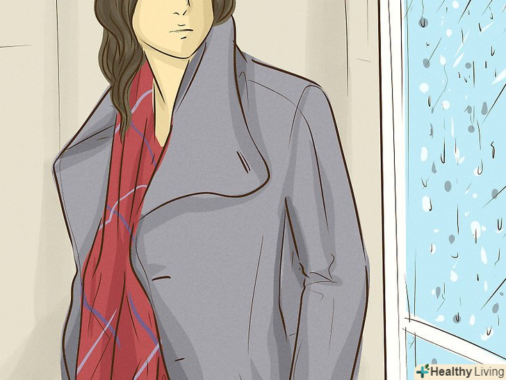 Носіть одяг з теплих матеріалів.для найкращих результатів одягайте товстий одяг з довгими рукавами, наприклад піджаки і светри. Синтетичні матеріали, такі як нейлон, віскоза і поліестер, не настільки повітропроникні, як натуральні, тому утримують тепло близько до шкіри.[17]- Щоб ця стратегія була ще більш ефективною, спробуйте надіти відразу кілька шарів одягу.