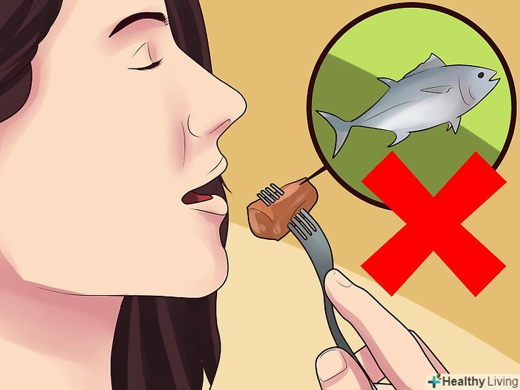 Уникайте морепродуктів.як правило, чим більшого розміру морепродукт, тим вище ризик. Кит, акула, тунець та інші великі риби містять підвищений рівень ртуті через забруднення води промисловими підприємствами.