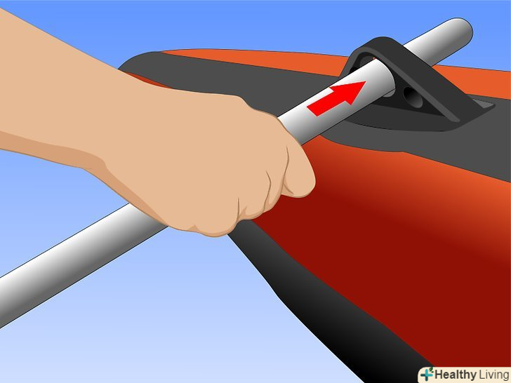 Підключіть до човна весла, протягнувши їх через штир або через кільця, розташовані на верхній частині човна. залежно від розміру човна, в комплекті може бути, як одна пара весел, так і дві. Великі човни також можуть комплектуватися мотором.- Весло приєднано до човна, але лопать повністю контролюється весляром надувного човна.