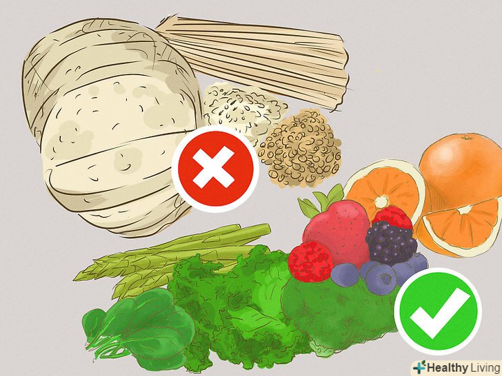 Уникайте рафінованих вуглеводів.у них міститься багато цукру, який перетравлюється швидко (глюкози), а це різко підвищує рівень інсуліну в крові і змушує яєчники виробляти більше тестостерону. Процес схожий на діабет другого типу, тільки ефект проявляється відразу.[15] з цієї причини слід відмовитися від рафінованих вуглеводів (тобто від усього, що містить кукурудзяний сироп з великою концентрацією фруктози) і замінити їх більш корисними вуглеводами: цільнозерновими продуктами, свіжими ягодами і цитрусовими фруктами, овочами з великою кількістю клітковини, листовими овочами і бобовими.- Скоротіть вживання наступних продуктів або зовсім відмовтеся від них: цукерки, печиво, пироги, готова випічка, морозиво, шоколад, солодкі газовані напої та інші напої з цукром.