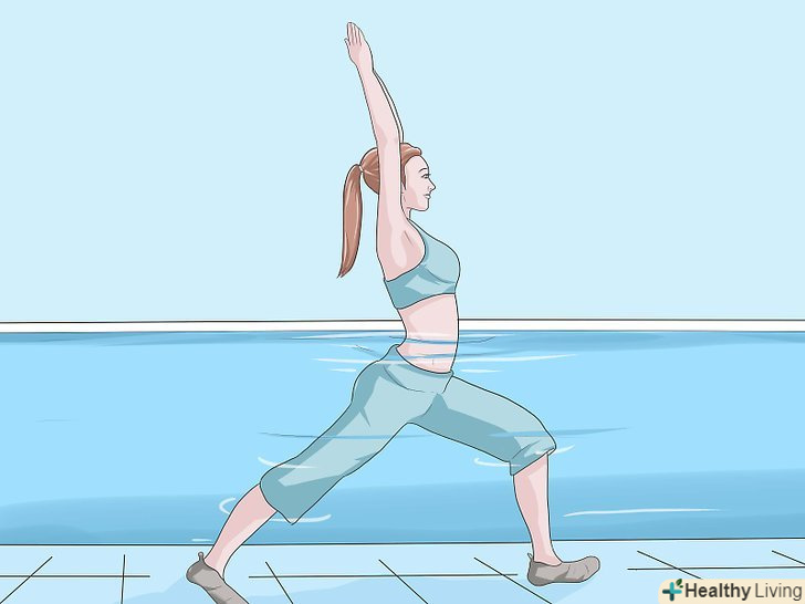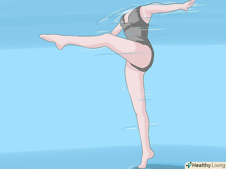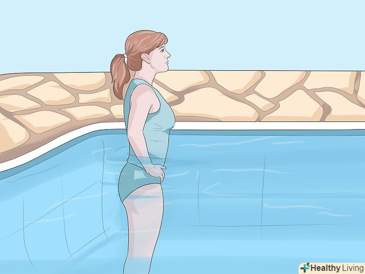 Маршируйте у воді.можете виконувати цю вправу, однією рукою тримаючись за стіну, або відійти від стіни так, щоб вода доходила до пояса. Почніть робити кроки, піднімаючи коліна якомога вище.- Далі робіть те ж вправу з другою ногою. Намагайтеся, щоб ваші стегна були паралельні поверхні води. Маршируйте протягом 5 хвилин або поки не відчуєте втому в м'язах. Ця вправа розтягує і робить сильніше ваші стегна, сідниці, черевні і спинні м'язи.