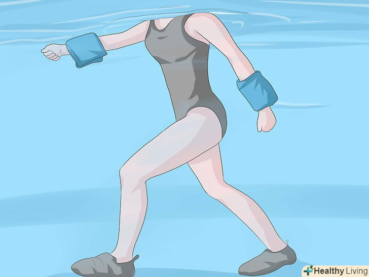 Ускладніть кардіотренування, надівши Водний ремінь, великий пінопластовий ремінь, який застібається на поясі.перейдіть на ту ділянку басейну, де рівень води доходить до грудей, і почніть бігати. У цьому русі ваші ноги не будуть торкатися землі, але ви будете розмахувати ліктями, і бігти на місці.- Зосередьтеся на кожному кроці, ходите з п'яти на носок, а не з носка на п'яту. Це буде імітувати природну ходьбу або руху при бігу підтюпцем, допомагаючи зміцнити м'язи, які задіюються при повсякденній ходьбі. Ви буде переміщатися вздовж по воді дуже повільно.
