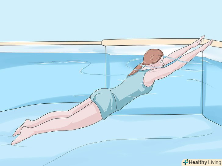 Зробіть розтяжку супермена.лежачи на животі, тримайтеся за край басейну. Витягніть ноги настільки далеко, наскільки це можливо.- Утримуйте положення протягом 30 секунд і повторіть 3 рази. Ця вправа утворює м'який прогин в спині, розтягуючи живіт, спину, плечі, м'язи ніг.