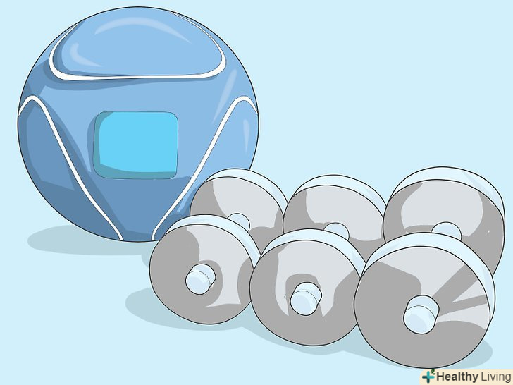 Напружте м'язи живота, зігнувши його.Опускайте баласт, поки руки повністю не випростаються. Повільно підніміть баласт, поки руки не опиняться в положенні під кутом 90 градусів.- Повторіть 2-3 підходи по 12 разів. Зупиніться, якщо відчуєте втому в м'язах або тиск в спині. Ця вправа зміцнить ваші руки і корпус. Переконайтеся, що тримайте живіт в зігнутому положенні протягом усього вправи.