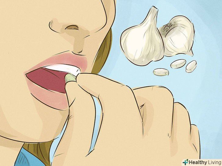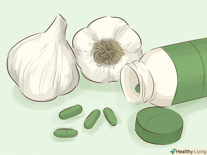 Приймайте часникові добавки.добавка-відмінний спосіб збільшити споживання часнику.[26]- Перед прийомом добавок поговоріть з лікарем. При деяких захворюваннях або використанні деяких лікарських препаратів не можна приймати часникові добавки. Попросіть лікаря порекомендувати Вам високоякісну часникову добавку.[27]