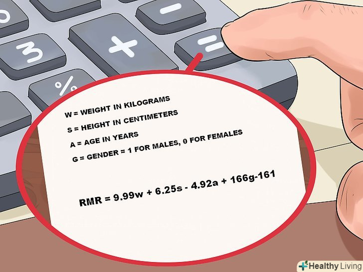 Визначте свою швидкість обміну речовин в стані спокою.даний показник дуже схожий з базовою швидкістю метаболізму (БСМ). І хоча ці індекси трохи різняться, знати один з них досить в тих випадках, коли потрібно втратити вагу. Даний показник допоможе визначити, скільки калорій необхідно вашому організму. Чим більше ви важите, тим вище буде БСМ. Щоб обчислити БСМ, можна використовувати формулу Міффіна-Джеора - вона вважається більш надійною в порівнянні з формулою Харріса-Бенедикта.[18] крім того, в Інтернеті можна знайти спеціальні калькулятори, які розрахують все за вас:- БСМ = 9,99 м + 6,25 Р - 4,92 в + 166П-161