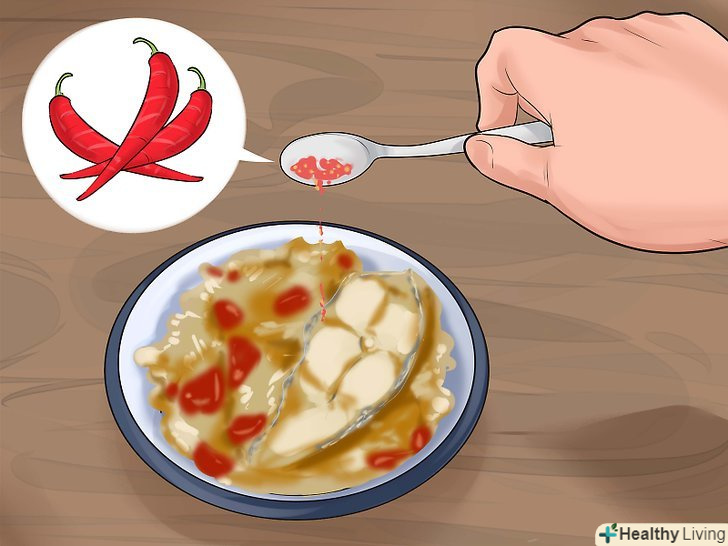 Додавайте до своїх страв спеції.приправивши їжу запашним, меленим червоним або кайенским перцем, ви прискорите обмін речовин. Ефект від пряної і гострої їжі носить тимчасовий характер, але ви можете додавати трохи спецій в усі страви щодня, підтримуючи прискорений метаболізм.[3]- Ще однією хорошою добавкою до багатьох страв служить гострий соус. Він дозволяє прискорити обмін речовин, і при цьому містить дуже мало калорій.