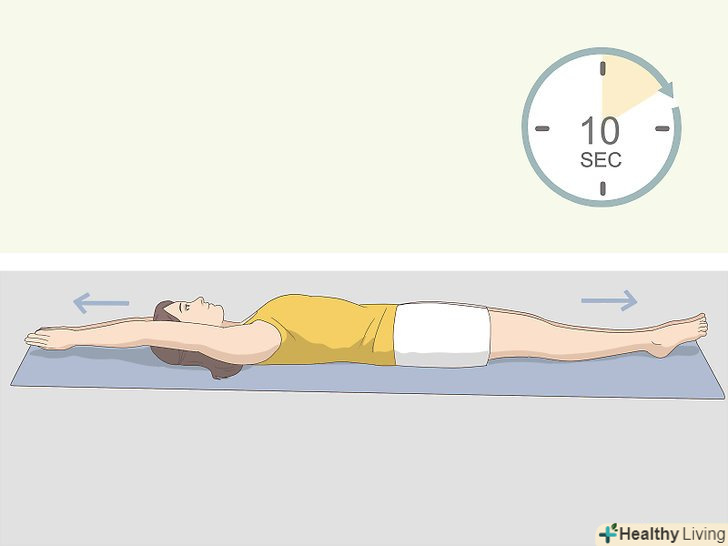 Ляжте на спину і випряміть руки за головою.необхідно лягти на спину на підлогу або на м'який килимок. Витягніть руки за головою і максимально їх випрямити. Одночасно тягніть обидві ноги в протилежну сторону. Затримайтеся в такому положенні на 10 секунд, а потім розслабтеся.[14]- Така вправа допоможе вам випрямити хребет. Самі кістки не стануть довшими, але тіло збільшиться в довжині від 2,5 до 7,5 сантиметрів завдяки декомпресії хребта. Повторюйте вправу кожен день, щоб зберегти результат.