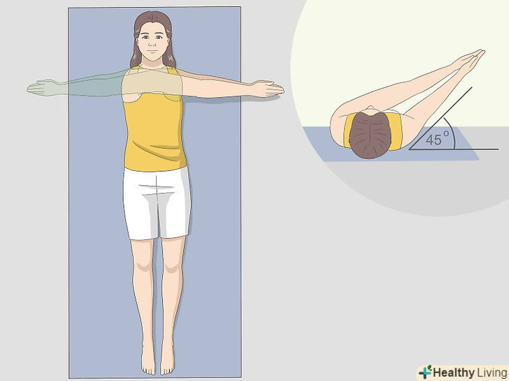 Виконуйте скручування верхньої частини тіла в положенні лежачи на спині.потрібно лягти на підлогу або на м'який килимок, випрямитися, потім підняти руки перпендикулярно грудній клітці. Стисніть долоні разом, а потім повільно опустіть руки вліво під кутом 45 градусів, щоб виконати скручування верхньої частини тіла. Затримайтеся в такому положенні на 2-3 секунди і виконайте поворот в іншу сторону. Виконайте 5 скручувань в кожну сторону.[15]- Виконуйте вправу кожен день, щоб розпрямляти хребет.