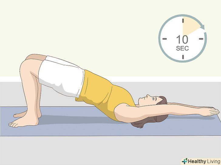 Ляжте на спину, заведіть руки за голову і підніміть стегна над підлогою.необхідно лягти на підлогу або на м'який килимок, випрямити руки за головою і стиснути долоні. Далі зігніть ноги в колінах і зведіть ступні разом. Потім упирайтеся ступнями і верхньою частиною спини в підлогу, щоб підняти стегна і витягнути хребет. Затримайтеся в такому положенні на 10 секунд, а потім розслабтеся.[16]- Щодня виконуйте вправу, щоб ваш зріст не краде.