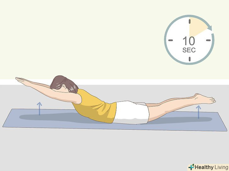 Ляжте на живіт, витягніть руки і ноги.переверніться на живіт, потім максимально витягніть руки і ноги. Повільно піднімайте руки і ноги вгору, щоб спина вигнулася дугою. Затримайтеся в такому положенні на 10 секунд, видихніть, опустіть руки і ноги на підлогу.[17]- Повторюйте вправу кожен день, щоб отримати постійні результати.
