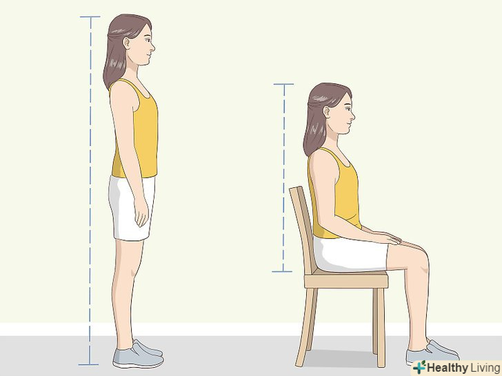 Слідкуйте за поставою, щоб здаватися вище.хороша постава не допоможе вам підрости, але так ви будете здаватися вище. Під час ходьби тримайте спину рівно. Слід відводити плечі назад і трохи піднімати підборіддя. Також випрямляйте спину, відводите плечі і тримайте голову рівно, коли сидите.[8]- Слідкуйте за поставою за допомогою дзеркала або записуйте себе на відео. Тренуйтеся стояти, ходити і сидіти з рівною спиною.