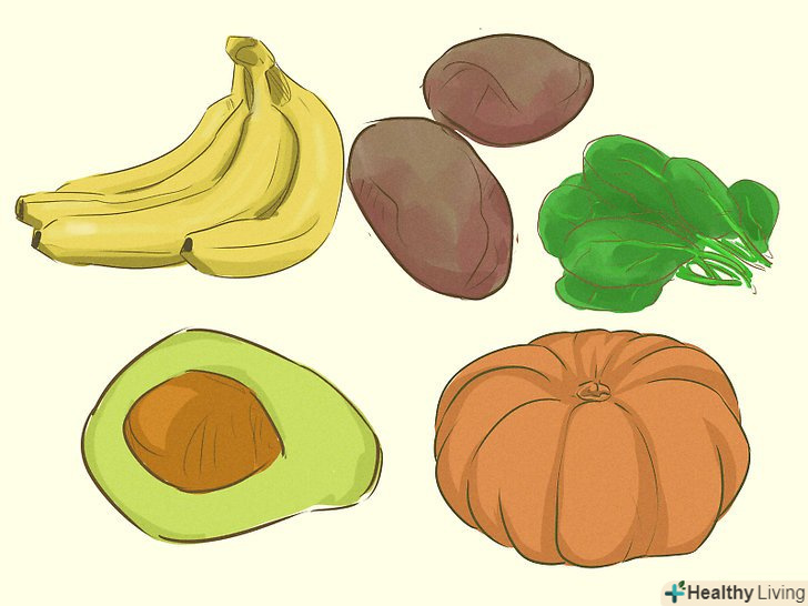 Їжте більше калію.калій, як і натрій, є важливим електролітом, який необхідний для здоров'я організму. Більшість людей споживають занадто багато натрію і досить мало калію. Якщо ви будете отримувати достатньо калію з їжею, то він допоможе організму позбутися від надлишок натрію.[14] ось хороші джерела калію:- Запечена картопля з шкіркою,