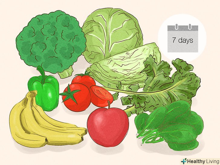 Їжте тільки фрукти і овочі протягом 7 днів. фрукти та овочі містять вітаміни, мінерали та інші поживні речовини, які потребує ваш організм для підтримки здоров'я. Вживайте різноманітні продукти, щоб отримати всі поживні речовини. Використовуйте наступні посібники для визначення, що їсти під час дієти:- Клітковина міститься в червоній квасолі, чорних бобах, яблуках, соєвих бобах, чорниці та артишоках. [10]