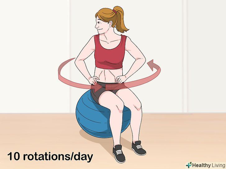 Виконайте повороти хребта. повороти хребта в різні боки тренують не тільки параспінальні м'язи поруч з хребтом, а й інші основні групи м'язів, включаючи косі м'язи, м'язи черевного преса і тазові м'язи. Підтримка основних груп м'язів в тонусі різко знижує ризик отримання травм спини і виникнення болю. [3] якщо ви відчуваєте гострий біль при поворотах з боку в бік, негайно зверніться до лікаря (наприклад, до мануального терапевта або остеопату), так як це може вказувати на проблеми з з'єднаннями хребта. Для зниження ризику виникнення болю в спині, спершу переконайтеся, що у вас досить натреновані основні групи м'язів. Повороти хребта також відмінно підходять для зміцнення попереку і профілактики болю, тому що вони одночасно розтягують м'язи спини і торсу. Повторіть вправу 5 разів з кожного боку, 2-3 рази на день.- Сядьте прямо на фітбол і підніміть руки над головою (або покладіть їх на стегна), ваші ноги при цьому повинні твердо стояти на підлозі.