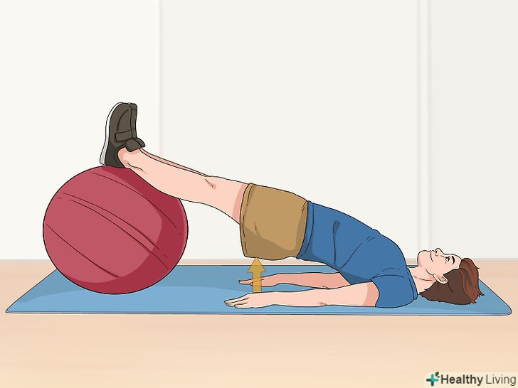 - Щоб збільшити складність вправи, поставте одну ногу на м'яч, а іншу підніміть на 2,5 - 5 см над ним. Тримайте ногу прямо, коли будете піднімати таз від землі, затримайтеся так на 10-30 секунд, потім опустіться і поміняйте ногу.