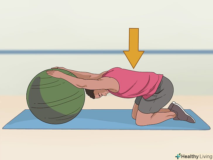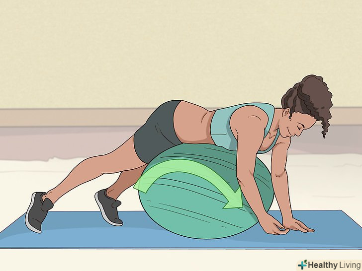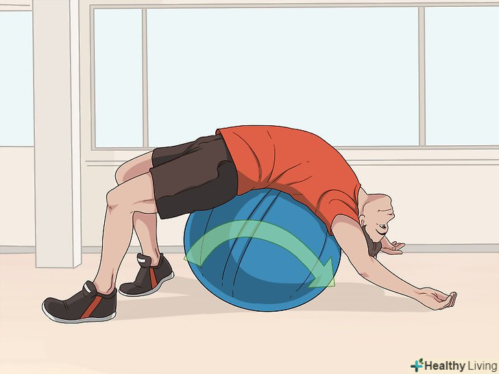 Почніть з розтяжки спини. розтяжка спини на фітболі з нахилом вниз призначена для розтягування глибоких параспінальних м'язів попереку, при цьому також розтягуються м'язи живота в передній частині тулуба. Ця вправа нагадує за своєю дією вправу на підйом тулуба від підлоги. Слабкі і натягнуті параспинальные м'язи вважаються досить частою причиною виникнення болю в попереку, тому ми і займаємося їх зміцненням. [2] зробіть 3 підходи по 10 повторень, відпочиваючи приблизно хвилину між підходами, але за умови, що ви не будете відчувати різких болів. В іншому випадку спершу зверніться за консультацією до лікаря.- Ляжте на фітбол животом і витягніть ноги, використовуючи стопи і пальці ніг для підтримки рівноваги (в цьому Вам допоможе взуття на гумовій підошві). Також можете спробувати уперти ноги об нижню частину стіни.