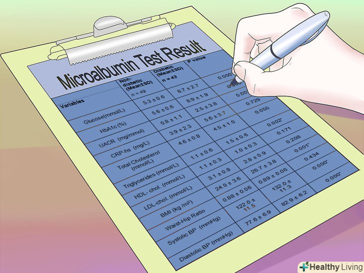 Регулярно перевіряйте рівень альбуміну. [10] дуже важливо періодично перевіряти рівень мікроальбуміну — це допоможе вам зрозуміти, як ваш спосіб життя впливає на функції печінки і нирок. Аналіз рівня мікроальбуміну дозволяє перевірити кількість альбуміну в сечі. Чим раніше буде виявлена проблема, тим ефективніше буде лікування, що сприятливо позначиться на ступені пошкодження нирок.- Щоб перевірити рівень мікроальбуміну, вам необхідно здати зразок сечі на аналіз. Це може бути простий аналіз сечі, зібраний в будь-який час доби, а може бути і добовий аналіз сечі, коли необхідно зібрати всю сечу за день і записувати час походів в туалет. [11]