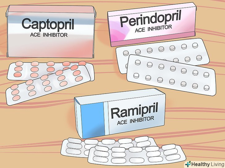 За призначенням лікаря почніть приймати інгібітори ангіотензин-перетворюючого ферменту (інгібітори АПФ). ці препарати пригнічують перетворення ангіотензину I в ангіотензин II. В результаті їх дії кровоносні судини розширюються, внаслідок чого знижується загальний периферичний опір судин-іншими словами, знижується артеріальний тиск. Інгібітори АПФ довели свою ефективність щодо зменшення білка в сечі. [13]- Найбільш поширеними інгібіторами АПФ є каптоприл, периндоприл, раміприл, еналаприл, лізиноприл. Лікар допоможе вибрати найбільш підходящий для вас препарат.