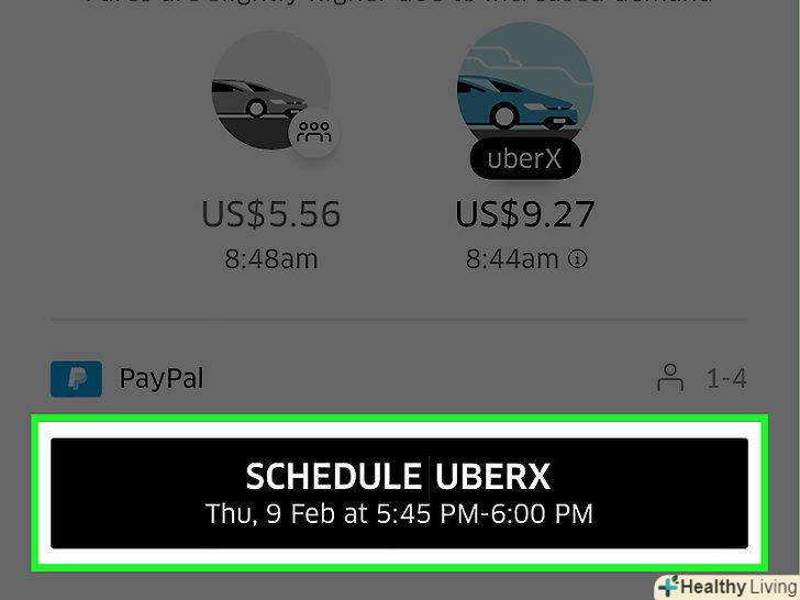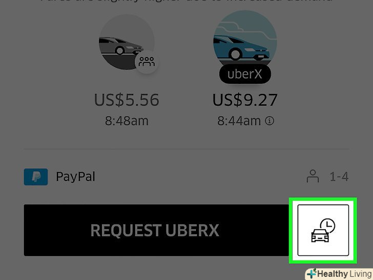 Натисніть квадратну кнопку з правого бокуЗамовити Uber.на екрані з'явиться машина, поруч з якою буде вказано час. Якщо ви не бачите цю функцію, значить в місці, в якому ви знаходитесь, недоступний попереднє замовлення.[1]- Якщо для обраного вами напрямку доступна машина UberPOOL, Uber автоматично вибере її для вашої поїздки. Якщо ви не можете забронювати UberPOOL заздалегідь, спробуйте вибрати інший вид, щоб переконатися, чи доступне попереднє замовлення у вашій місцевості.