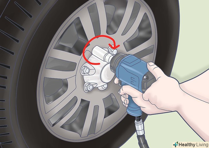 Почніть з правого заднього колеса, видаліть забруднення з області, де розташований гвинт для випуску повітря, і зніміть з нього гумовий пилозахисний ковпачок.за допомогою накидного ключа відкрутіть випускний гвинт. Візьміть шматок гумового вакуумного шланга, один кінець якого надіньте на випускний гвинт, а другий опустіть в порожню прозору пластикову пляшку.