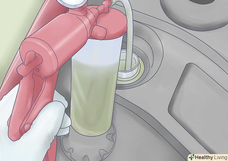 Тримайте накидний ключ, утримуючи пластикову пляшку.Попросіть вашого партнера накачувати гальма повільно, поки брудна рідина не виллється з гальмівних трубок в пляшку. Дозвольте рідині виходити до тих пір, поки кінець гумового шланга не буде занурений в гальмівну рідину. Постійно перевіряйте, щоб в головному циліндрі було достатньо гальмівної рідини.