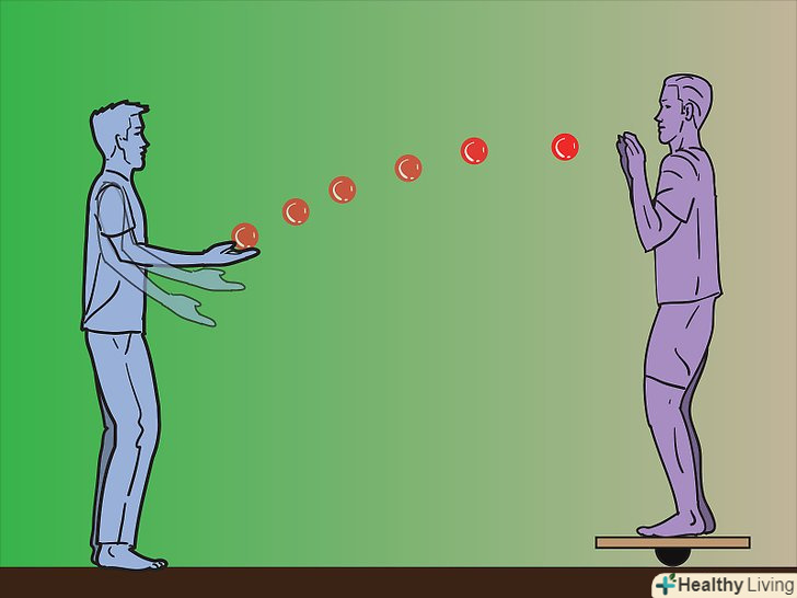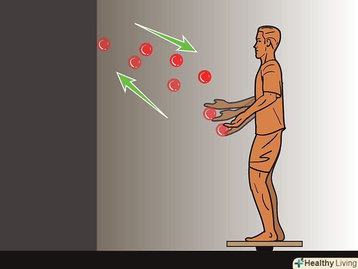 Кидайте м'яч в стіну і ловіть його.- Ви також можете тренуватися разом з другом, який зможе здійснювати більш хитромудрі кидки, коли ваше почуття рівноваги значно покращиться.
