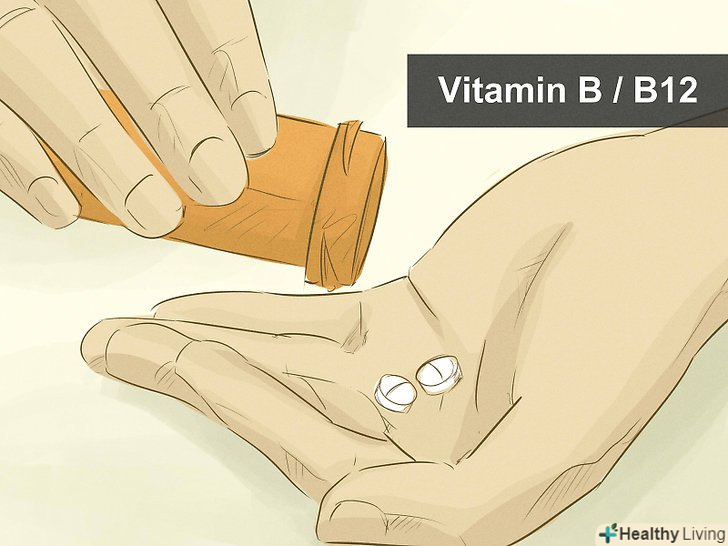 Приймайте добавки, що містять вітамін В12.вітамін В12 допомагає вашому організму виробляти червоні кров'яні тільця.[16] це зменшує симптоми низького рівня гемоглобіну і допомагає боротися з анемією, яка викликана нестачею заліза в крові.- Вітамін В12 в природному вигляді міститься тільки в білках тваринного походження. Рослини не містять природного вітаміну В12, тому деякі рослинні продукти додатково збагачують цією речовиною.