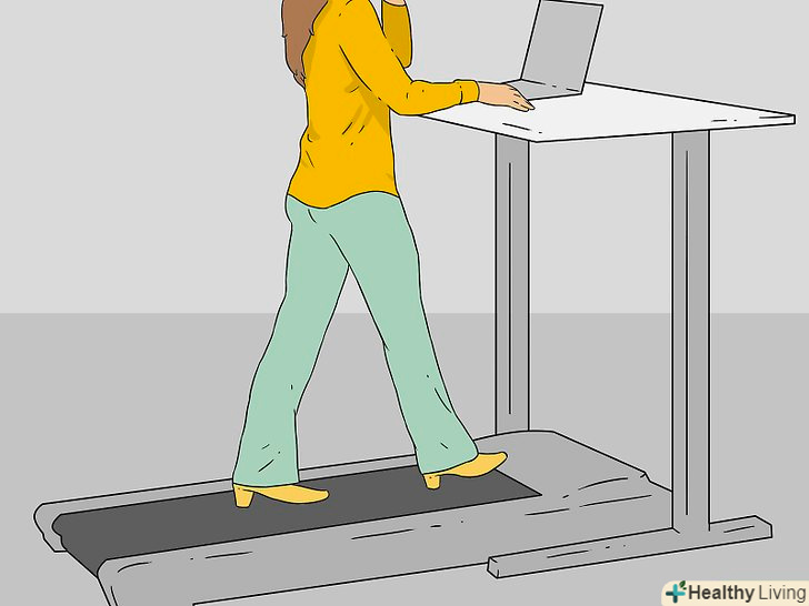 Ходіть на місці при виконанні стаціонарних завдань.якщо ви дивитеся телевізор або говорите по телефону сидячи, то втрачаєте можливість збільшити кількість пройдених кроків. Ходьба на місці або пересування вперед-назад при виконанні стаціонарних завдань дозволить проходити більше кроків без відчуття додаткового навантаження.[13]- Купуйте робочий стіл з біговою доріжкою, щоб збільшити кількість кроків, пройдених під час роботи. Такий стіл буде коштувати від 32000 до 64000 рублів.