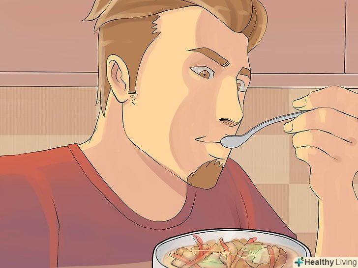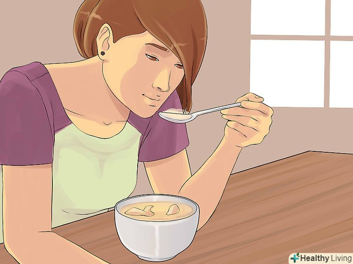 Їжте м'яку і негостру їжу. Вживайте побільше супів і бульйонів. Ваша бабуся була права, коли говорила про те, що курячий суп допомагає вилікувати застуду. Дослідження показали, що курячий суп здатний уповільнювати переміщення певних клітин імунної системи і тим самим підвищувати їх ефективність. Крім того, курячий суп збільшує рухливість крихітних волосків в носі, що допомагає боротися з інфекцією.[2] добре підходить також наступна м'яка негостра їжа:- Яблучне пюре;