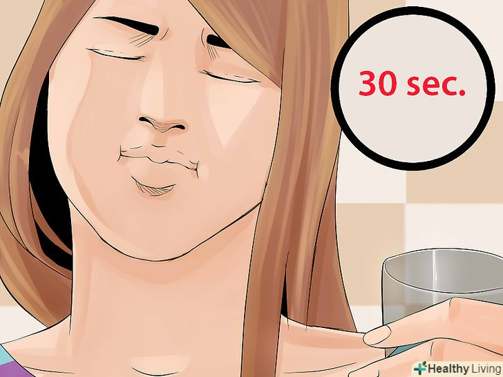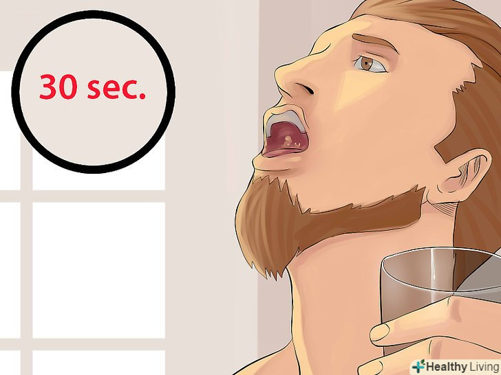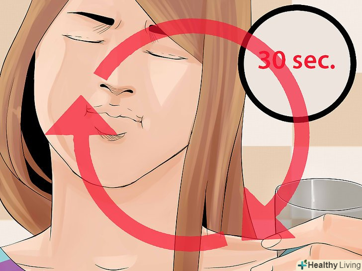 Полощіть горло розчином протягом 30 секунд.для цього зробіть глибокий вдих і наберіть в рот 50-80 мілілітрів води, але не ковтайте її. Відкиньте голову назад приблизно на 30°, тримаючи при цьому закритою задню частину горла, і полощіть горло протягом 30 секунд, після чого виплюньте рідину.- Якщо горло болить у дитини, спробуйте давати йому спочатку просту теплу воду. Єдине вікове обмеження даного методу лікування полягає в тому, щоб дитина могла Полоскати горло, не ковтаючи воду — зазвичай діти вміють це з трьох-чотирьох років. Щоб дитина полоскав горло протягом 30 секунд, спробуйте перетворити все в гру і попросіть дитину наспівувати про себе якусь коротку пісеньку.
