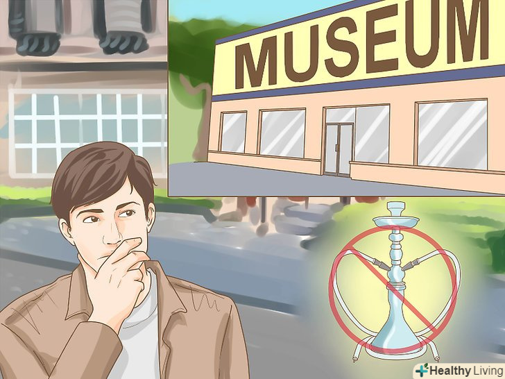 Припиніть ходити в кальянні.після рішення кинути палити кальян потрібно перестати ходити в кальянні. Саме там відбувається спокуса. До того ж, в кальянній доводиться постійно вдихати дим, що ніяк не сприяє новим звичкам.[8]- Почніть ходити в інші місця. Вибирайте бари, в яких не можна курити. Ходіть в кінотеатри, музеї або магазини. Намагайтеся перебувати подалі від місць, в яких дозволено курити.