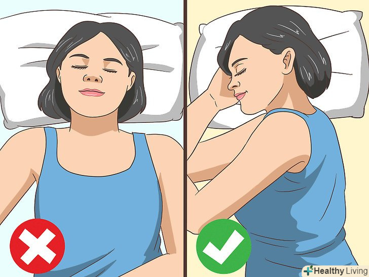Спите на боці.як правило, людина дихає ротом, коли спить на спині. Під час сну на спині вам доводиться важче дихати ротом. Спробуйте змінити позу для сну, щоб звести до мінімуму дихання ротом і хропіння.[13]