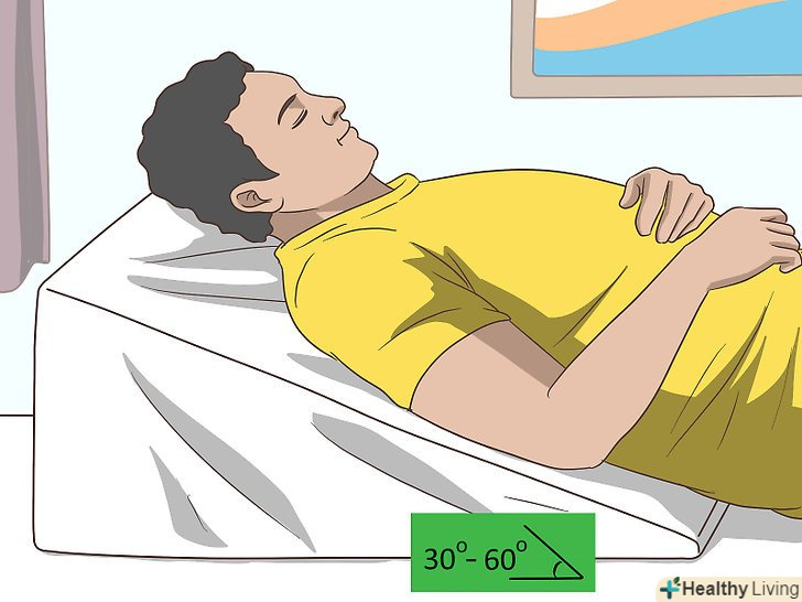 Підніміть голову і верхню частину спини, якщо ви спите на спині.якщо ви повертаєтеся на спину за звичкою, підкладіть під голову додаткову подушку, щоб вам краще дихалося під час сну. Візьміть подушку або інший предмет, щоб підняти верхню частину спини і голову, розташувавши їх під кутом в 30-60 градусів. Завдяки цьому ваш рот буде залишатися закритим під час сну, і ви почнете дихати носом.[14]
