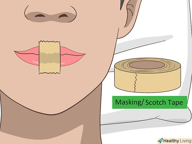Заклейте рот скотчем.відірвіть шматок скотча і наклейте його вертикально на рот. Це дозволить тримати його закритим під час сну.[15]- Кілька разів прикладіть клейку частину скотча до руки, щоб прибрати трохи клею. Після цього скотч буде легше прибрати з рота.